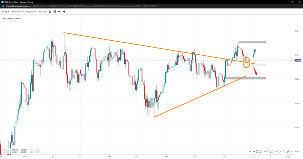 Wall Street continued in a breakout mode following the rising pennant pattern but took a breather lower, flipping the upper trendline into support. Above 34575 remains the 35k handle as resistance, while failing to hold the 33620 line might open the door to 33k.
