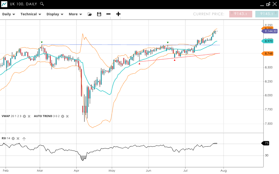 UK 100 is in an impulsive bullish phase, breaking above previous highs with price at 9,145 well above the VWAP at 8,970. The RSI is at 73, indicating strong buying pressure. Support is at 8,748 and resistance is at 9,101.