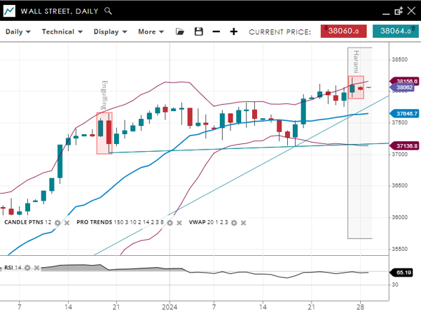 Wall Street is in an impulsive phase of  a bullish trend, indicated by its price well above the 20-period VWAP of 37,647. The support for this index is at 37,136, with resistance slightly above the current price at 38,157. The RSI is at 65, pointing towards strong bullish momentum without yet getting overbought.