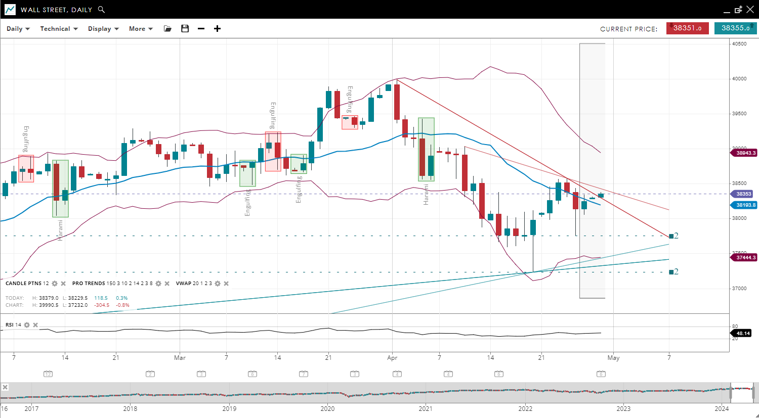 Wall Street has transitioned from an impulsive to a corrective phase despite the price slightly increasing to 38,353, which is just above the VWAP of 38,193. The support and resistance levels have also been updated to 37,444 and 38,943, respectively. The RSI has risen to 48, signalling a lessening of bearish momentum.