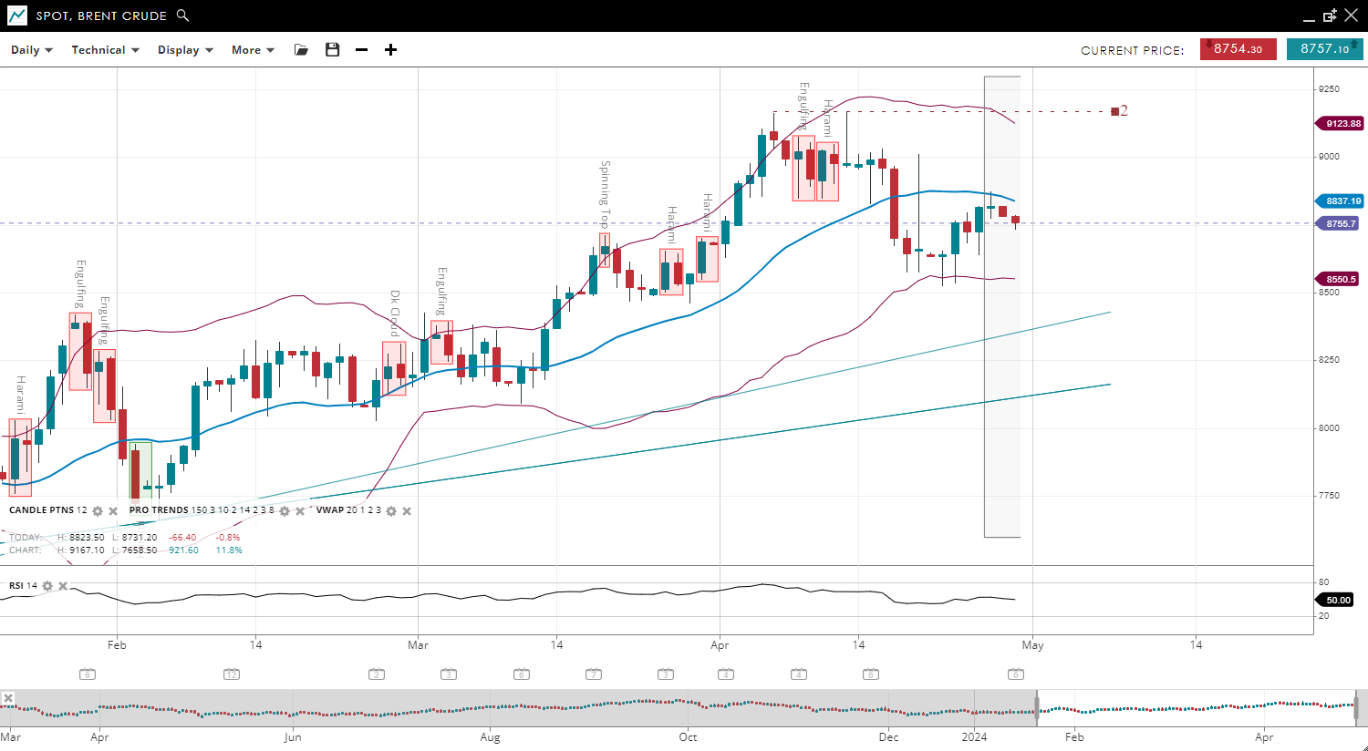 | Brent Crude | Bullish | Corrective | 85.66 | 88.73 | 85.41 | 92.05 | 39 |