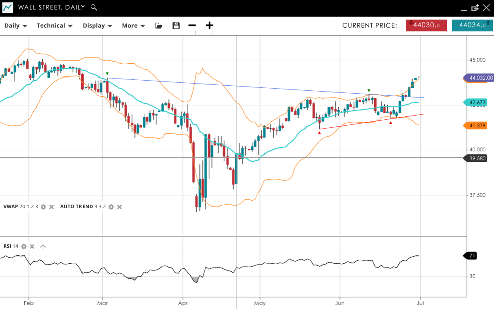 | Wall Street | Bullish | Breakout | 44,022 | 42,673 | 41,379 | 44,000 | 71 |