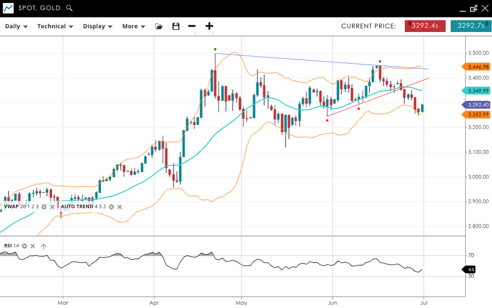 Gold is moving sideways in a neutral range, drifting lower after a failed breakout over 3,400, priced at 3,293 with VWAP at 3,349. RSI is soft at 44. Support comes in at 3,252 and resistance at 3,446.