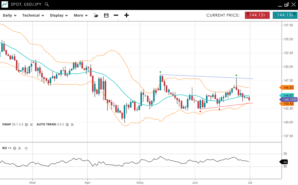 | USD/JPY | Neutral | Range | 144.13 | 144.87 | 143.42 | 146.42 | 46 |