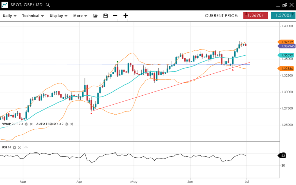 GBP/USD is bullish and moving impulsively. It trades at 1.3700, above the VWAP of 1.3559. RSI at 63 signals steady upward momentum. Support sits at 1.3358, and resistance at 1.3761.