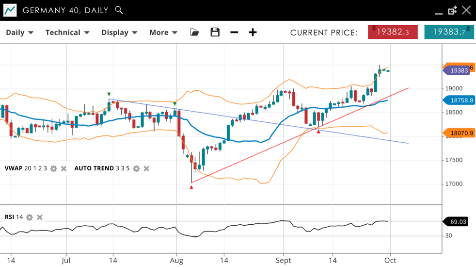 Germany 40 continues its bullish momentum in an impulsive phase. The current price is 19,383, sitting comfortably above the VWAP (20) at 18,758. Support is located at 18,070, while resistance is slightly higher at 19,400. The RSI of 69 signals strong bullish momentum, approaching overbought conditions.