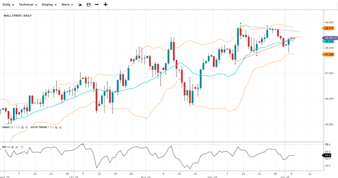 Wall Street remains in a bullish trend but is undergoing a correction phase. Trading at 48,385, it is slightly above the VWAP of 48,262. RSI at 54.9 suggests sideways momentum with support at 47,746 and resistance at 48,777.
