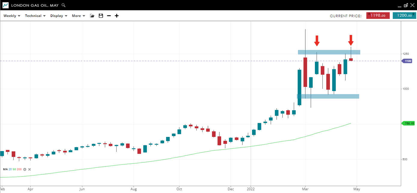 The London gas contract cannot seem to close the week over 1250, and has started the new week with another failed break over the level. The implication is a drop to the bottom of the range near 900 - but the overall trend is higher while over the 50 week SMA.