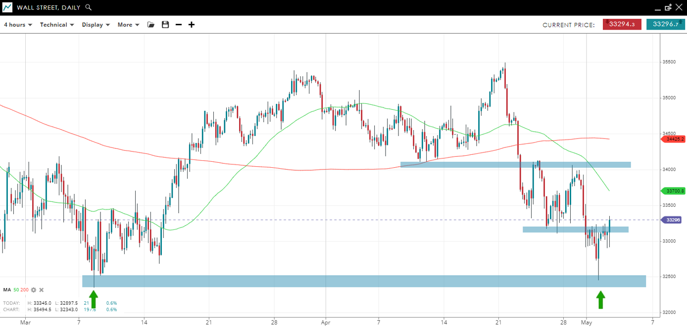 The price dropped back to support at 32,500 but avoided year-to-date lows and made a strong intra-day reversal back to the previous swing low at 33,200, which is resistance. The strong reversal offers scope for a bigger bounce with the 50 SMA then 34,000 next resistance.