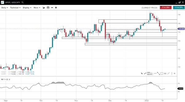 The false breakout to new highs on Jan 4 has led to a choppy pullback to the former record high from August 2021. Three long tails on daily candlesticks in the past week suggest strong demand.