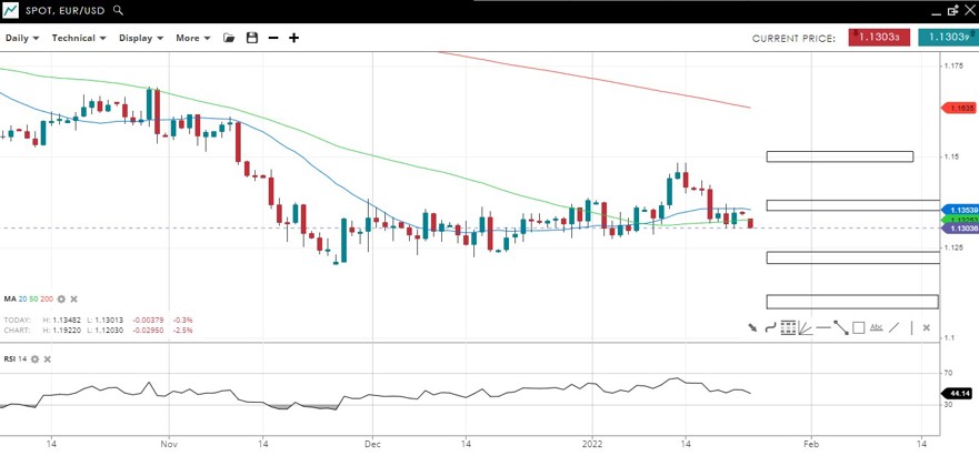 The hammer pattern last week was matched by a bearish shooting star off the 50 DMA and the price is back testing support at 113.50.