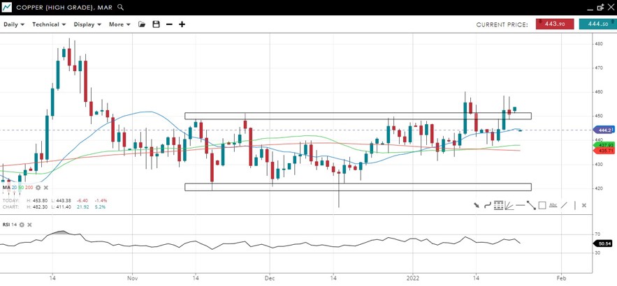 The price has twice failed a breakout of the trading range capped at 4.50 but continues to make higher lows. 420 is the bottom of the range, which could give way after another failed move up.