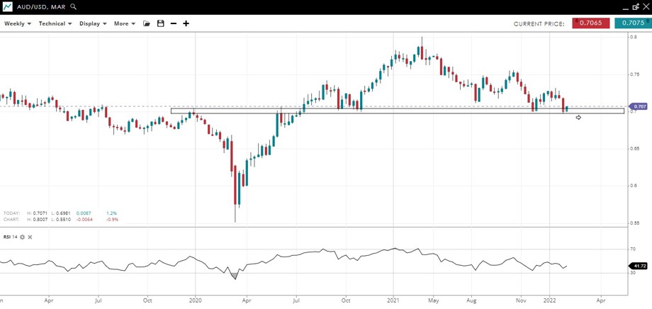 The price is testing critical round number support at 0.70, and the neckline of what could be a long-term bearish head and shoulders reversal pattern.