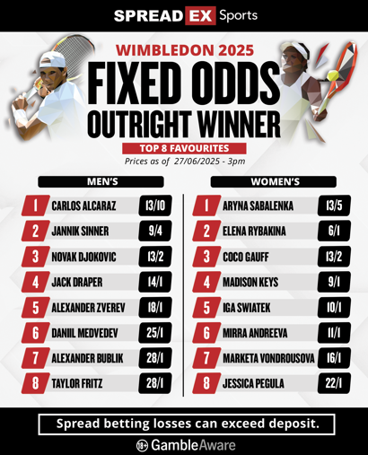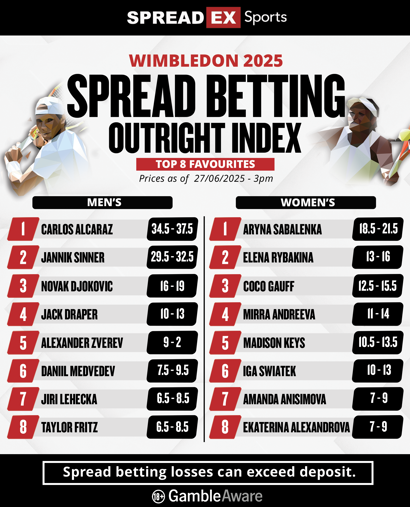 Read on below for Spreadex Sports' 2025 Wimbledon betting preview with the latest odds and spread betting prices ahead of the tournament as well as everything else you need to know before the first balls are hit on the quick and slippery hallowed turf of the All England Club!