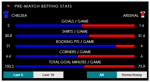To see all the Chelsea v Arsenal betting stats and form, visit our pricing page to view our Pre-Match betting stats table or hover over/tap the chart image to see previous outcomes for that particular market.