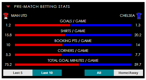 To see all the Man Utd v Chelsea betting stats and form, visit our pricing page to view our Pre-Match betting stats table or hover over/tap the chart image to see previous outcomes for that particular market.