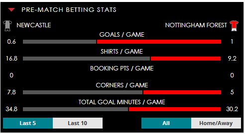To see all the Newcastle v N. Forest betting stats and form, visit our pricing page to view our Pre-Match betting stats table or hover over/tap the chart image to see previous outcomes for that particular market.
